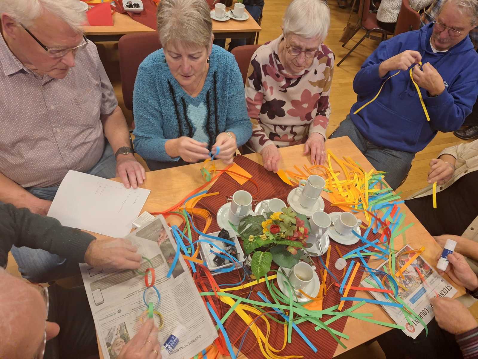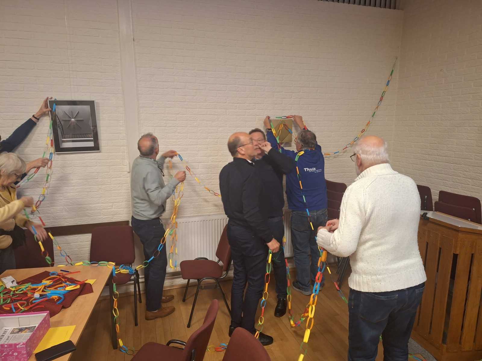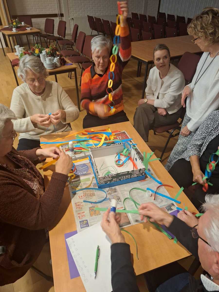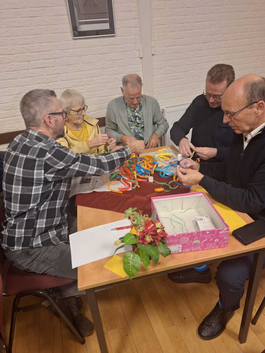 een mooie start voor het samenwerken van de verschillende groepen in het maken van een reuzenslinger, die door de hele zaal komt te hangen, over verbinding gesproken.